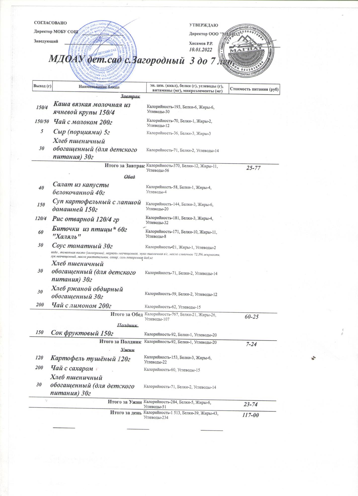 (Меню на 10.01.2022 года (от 3 до 7 лет))