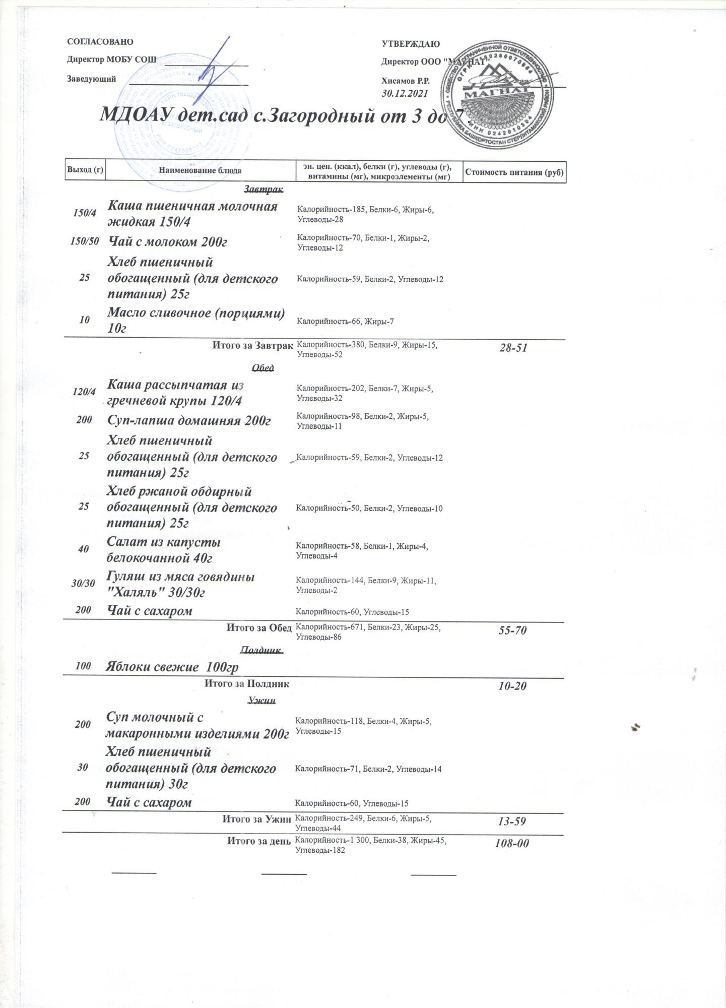 (Меню на 30.12.2021 года (от 3 до 7 лет))