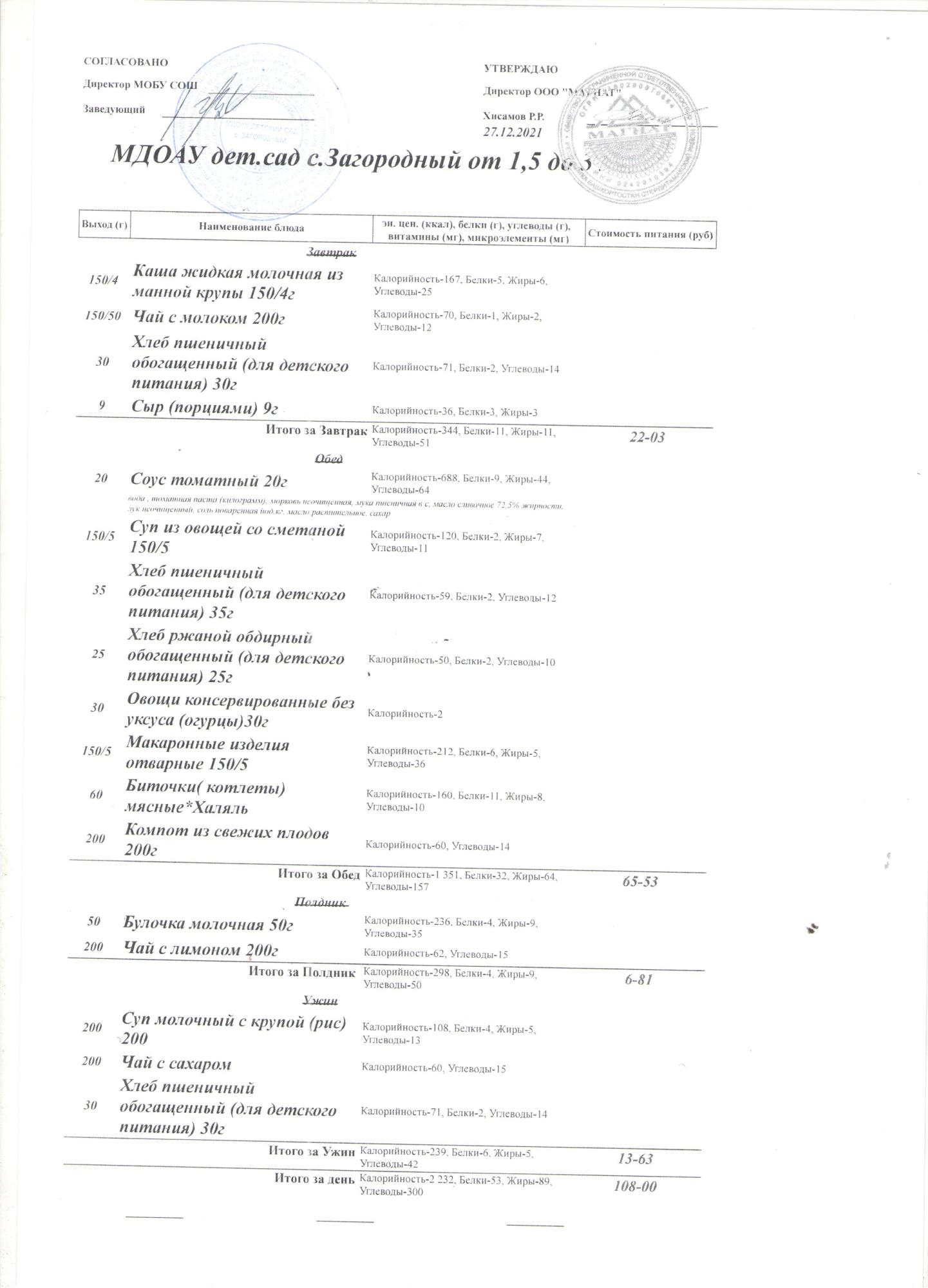 (Меню на 27.12.2021 года (от 1,5 до 3 лет))