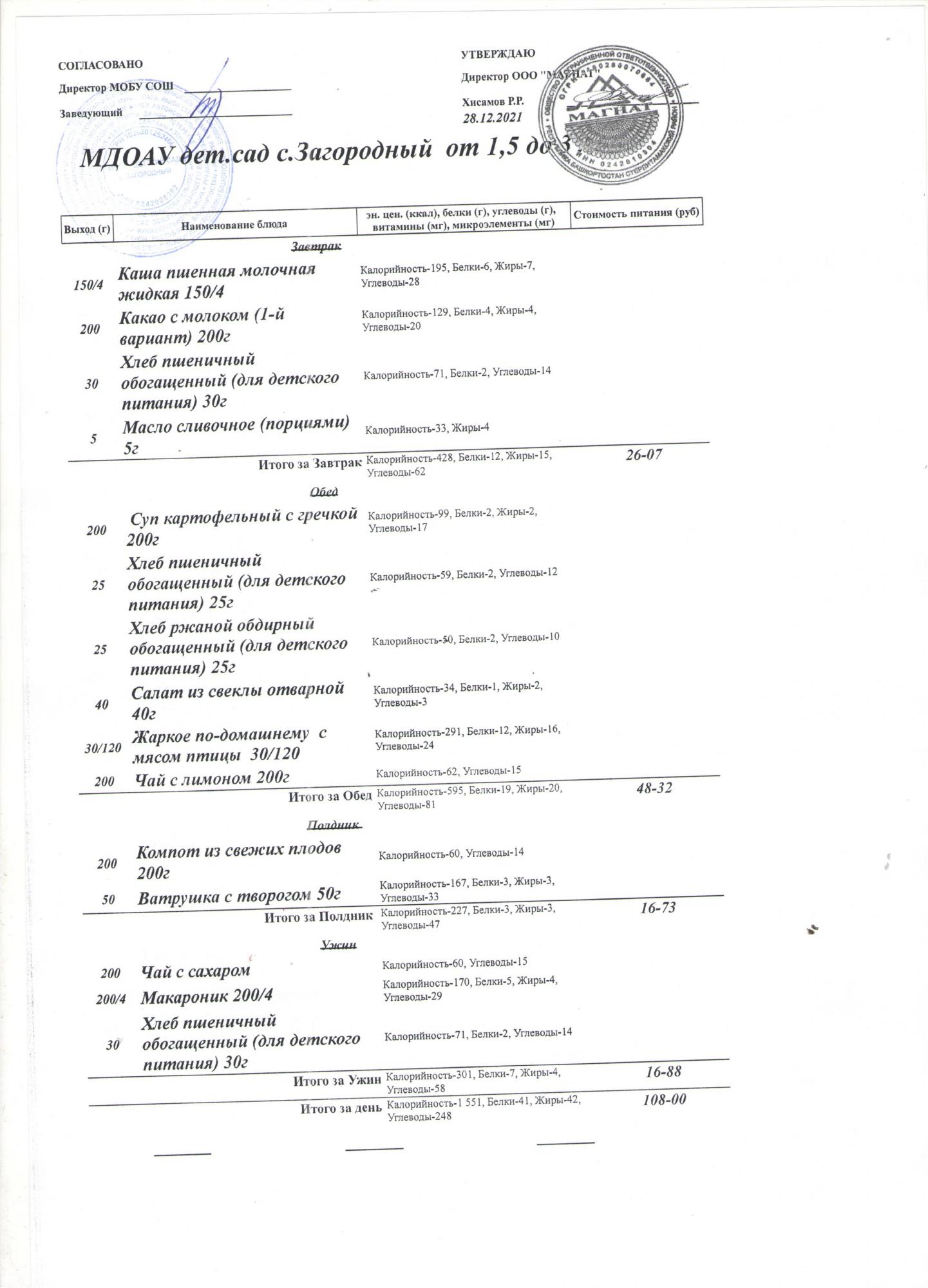 (Меню на 28.12.2021 года (от 1,5 до 3 лет))