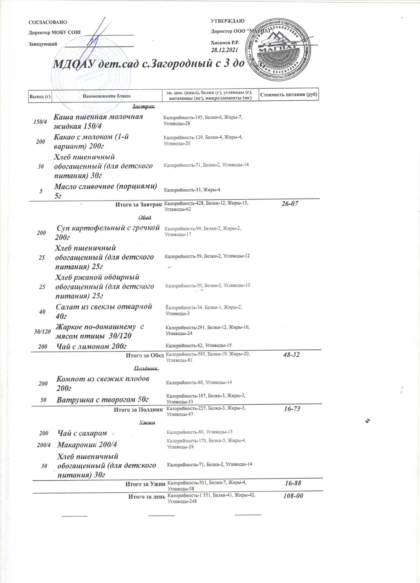 (Меню на 28.12.2021 года (от 3 до 7 лет))