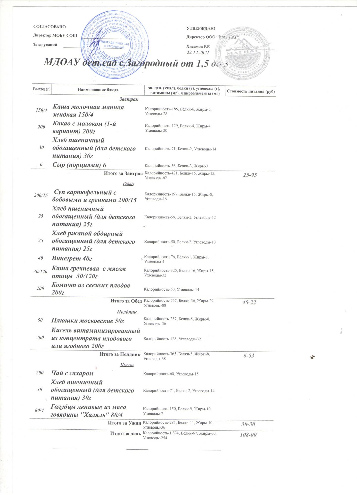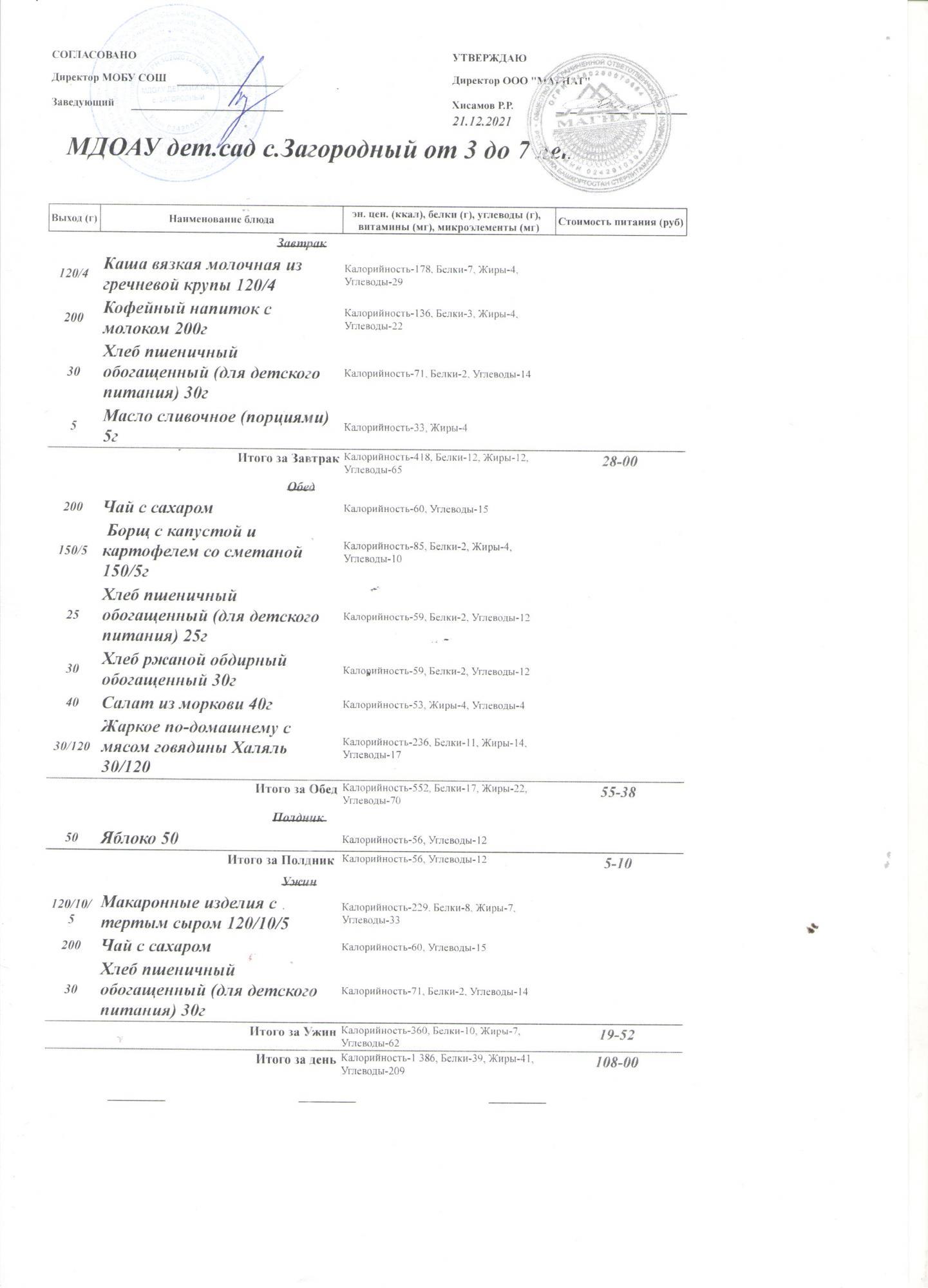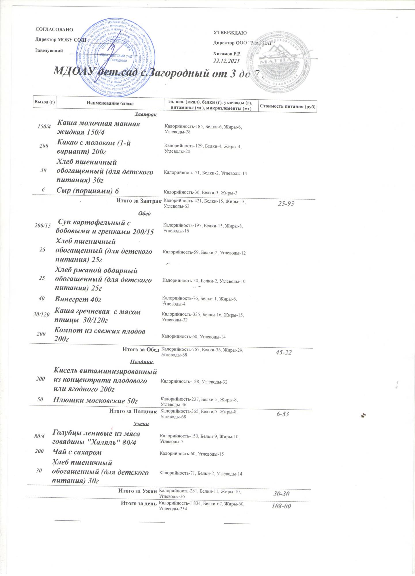 (Меню на 22.12.2021 года (от 3 до 7 лет))