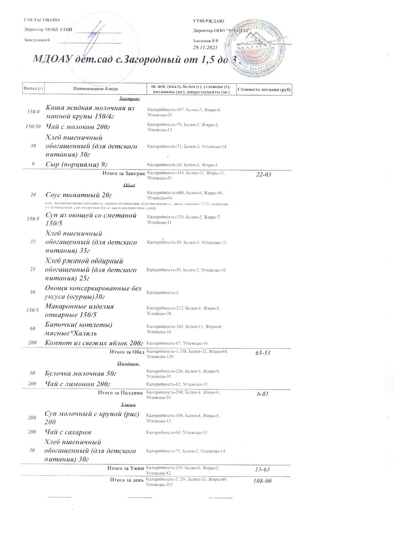(Меню на 29.11.2021 года (от 3 до 7 лет))