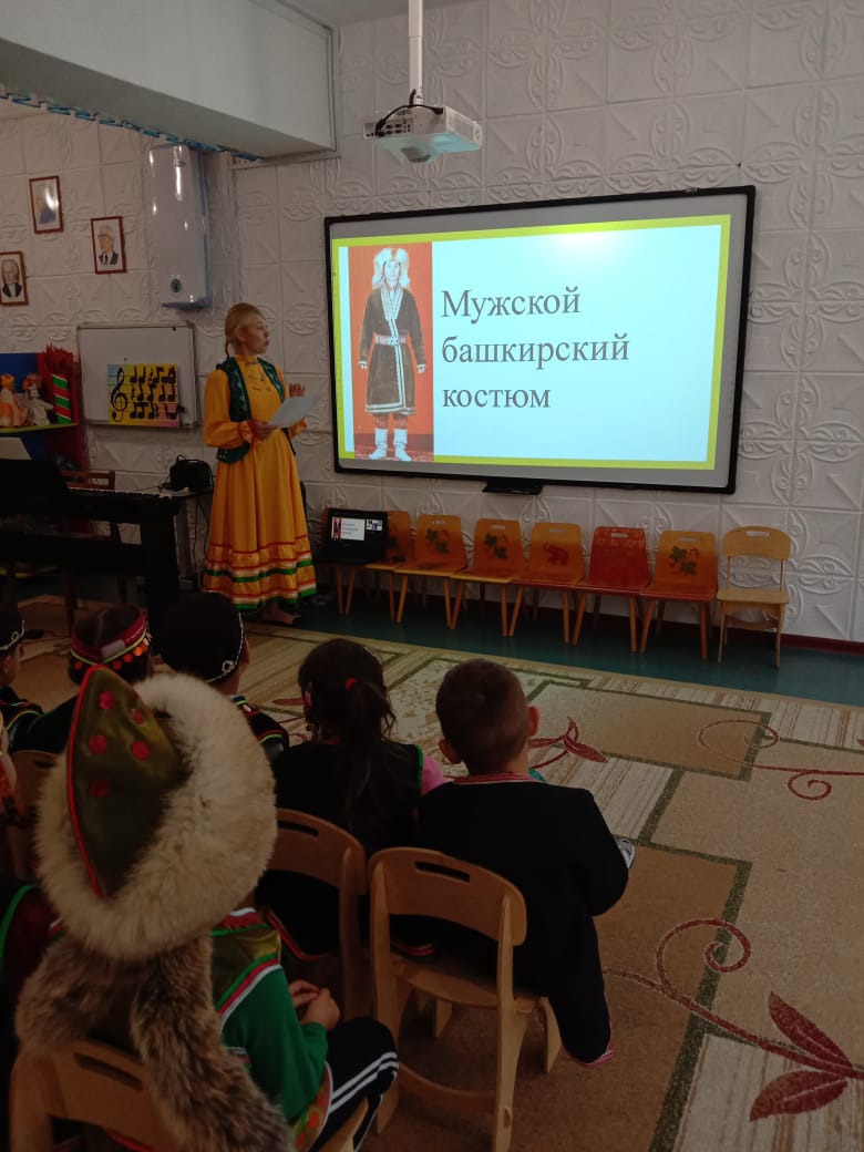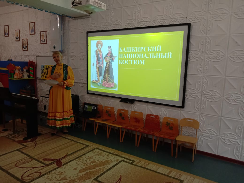 В группах прошли тематические занятия и беседы, выставки рисунков «Национальные костюмы народов Башкортостана», где в игровой форме дети познакомились с деталями, особенностями костюмов тех народов, которые проживают в нашей республике.